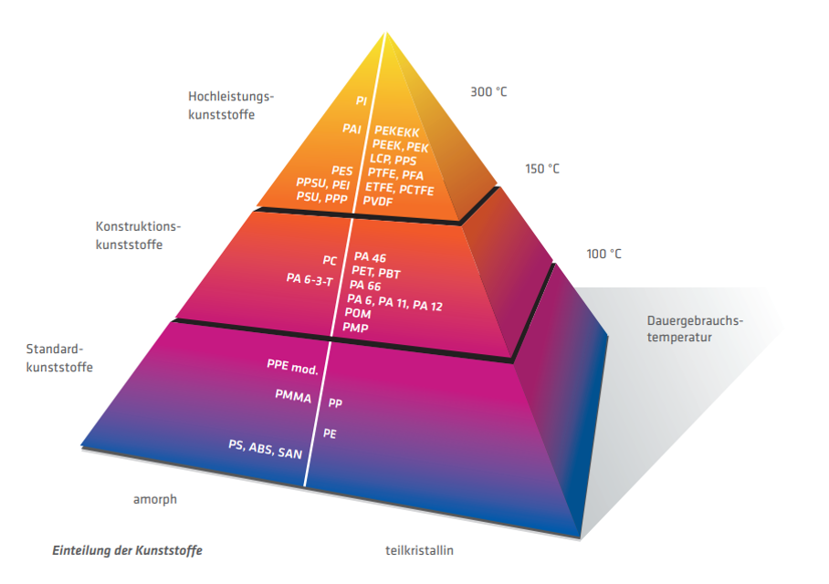 Konstruktionskunststoffe bilden die nächste Stufe und bieten verbesserte mechanische Eigenschaften. Sie können in einem Bereich mit höherer Dauergebrauchstemperatur verwendet werden. Auf Grund von hoher Transparenz, enormer Schlagfestigkeit und guter